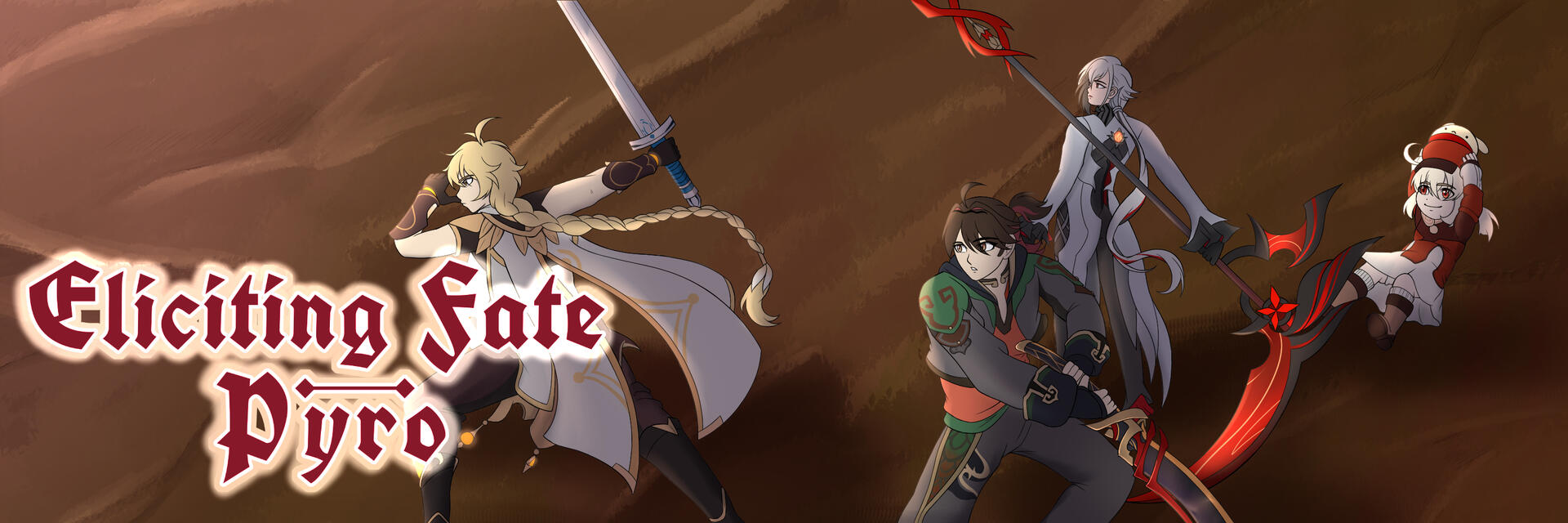 This is a free digital SFW Genshin Impact zine featuring certain Vision holders of each element showcasing them and their elemental abilities.Each volume of this series will focus on an element with themes and characters surrounding that element, exploring Vision application, lore, etc.Eliciting Fate's debute Volume's element is PYRO.An "allogene" is someone in Teyvat that has particularly strong desires and have the potential to ascend to Celestia by the gods' standards. Eliciting Fate as a series will explore what fate really is and what it means to be an allogene.The gaze of the gods has been a blessing to be desired. And those who have been touched by divine eyes are granted Visions. Allogenes, they are called. Out of countless, yearning souls, the divine gaze has reached you.Are You Ready to Face Your Fate?